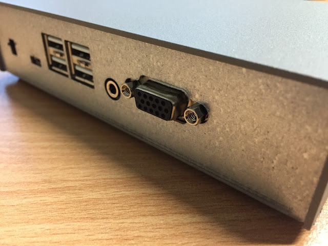 Flipping it around we have a VGA port, 4 usb ports (for connecting normal USB keyboard and mouse), a usb power connector and an on/off switch.